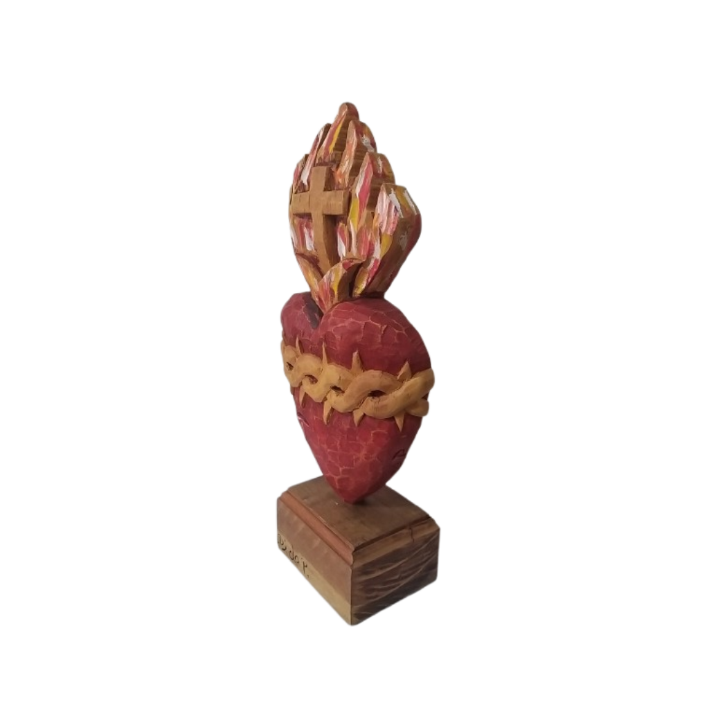 Escultura Sagrado Coração de Jesus em madeira é uma peça única feita de forma artesanal pelo Mestre Dido Pereira. A peça, entalhada sobre uma base de madeira natural,apresenta um belo coração flamejante, em vermelho e amarelo,cercado por espinhos e sobreposto por uma cruz, na imagem típica do Sagrado Coração de Jesus. Essa devoção está especialmente preocupada com o que a Igreja considera ser o amor e a compaixão sofridos do coração de Cristo em relação à humanidade. Em todas as Igrejas, nas primeiras sextas-feiras, se fazem atos solenes para estimular os cristãos e retribuir com amor as provas de amor que Jesus fez e faz por toda a humanidade.No processo de entalhe para alcançar a forma do objeto idealizado, Mestre Dido adota ferramentas, entre goivas e formões, muitas delas adquiridas de antigos mestres olindenses. Para o artista, elas guardam em si significados especiais: além da qualidade do material que resiste ao tempo, são testemunho daqueles que vieram antes e que fizeram da arte popular o sentido de suas vidas