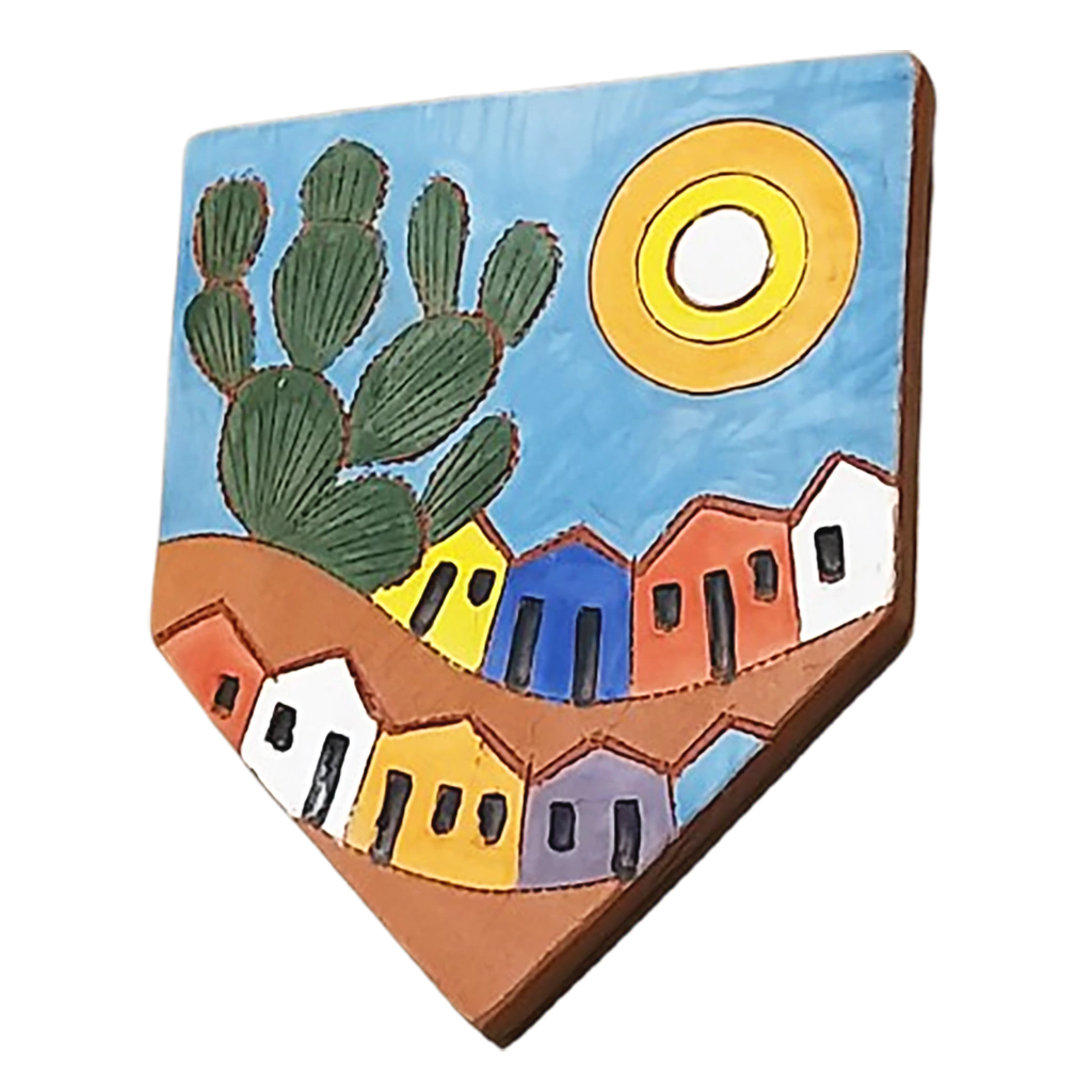 Bandeirola Cacto ao Sol adorno de parede em cerâmica é uma peça única feita de forma artesanal pelo artista baiano Jan Araújo. O adorno para parede, em formato de bandeirola, foi confeccionado artesanalmente em barro,transformando a matéria bruta em significado, com belo desenho colorido de casario contrastando com o azul do céu, o destacado cacto e o sol brilhante, e acabamento em pintura à mão. A Bandeirola é um objeto decorativo que consiste em uma sequência de bandeirinhas coloridas, dispostas de forma harmônica, em diferentes tamanhos, formatos e estampas.As peças de Jan Araújo são ornamentadas com desenhos elaborados em tons pastéis e ricos em texturas, onde aparecem plantas, animais, bandeirinhas, casinhas e outros elementos. As esculturas em cerâmica, depois de secas, são pintadas com corantes minerais especiais, em tons suaves e harmoniosos, e queimadas em forno elétrico – a temperatura de queima é de até 850 graus. Do renomado ceramista e grande artista Jan Araújo, esta escultura encanta! Verdadeira arte brasileira!