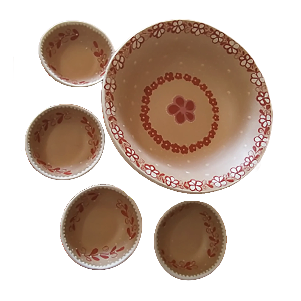 Conjunto Aconchego Floral Adobe de saladeiras redondas em cerâmicaé uma peça única feita de forma artesanal pela artista Anísia de Sousa do Vale do Jequitinhonha, em Minas Gerais. O conjunto é formado por uma saladeira grande e quatro pequenas, em formato circular, confeccionadas artesanalmente em barro com acabamento em pintura à mão em bege, e flores em adobe e branco com detalhes em rose.O barro é socado no pilão, peneirado e depois amassado para que possa ser moldado, e pintada com o próprio barro misturado com folhas e raízes, por meio da técnica do oleio, barro diluído em água com pigmentos naturais. Para a pintura de flores, as mulheres utilizam penas variadas. Depois de pintadas, as peças são queimadas em forno a lenha, geralmente nas noites de lua cheia. Leve um pouco de história e Arte Popular Brasileira para a sua casa!