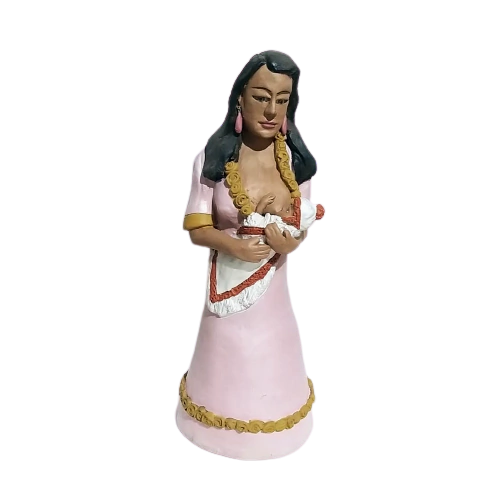 A escultura de barro representa uma mãe em lindo vestido rosa decorado com adornos em bege, negros cabelos soltos, amamentando seu bebê envolto em um xale branco com destaques em ocre, além de touca nos mesmos tons. Lucineia faz as peças modeladas a mão e usa a própria argila para fazer os pigmentos, que dão as cores das peças. Alguns dos pigmentos vão ao forno antes de queimar e outras cores faz com a argila depois de queimadas em forno artesanal a lenha. Para a artista, “As peças costumam falar. São caipiras como eu e muitas das vezes pego a argila para fazer o que está na mente e a argila em minhas mãos faz outras peças. Às vezes é a argila que modela em minhas mãos e não eu que modelo a argila.”