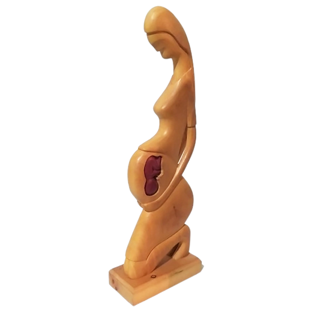 Escultura feita de forma artesanal pelo Mestre Elias França, na Paraíba, refletindo a beleza de ser mãe esculpida em madeira. A peça apresenta uma mulher grávida ajoelhada, em madeira natural em tom claro iluminado, com um brilho que remete à geração da vida, segurando a barriga com o bebê em tom de cedro. Material: Madeira e tonalizante.