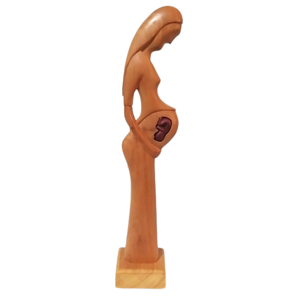 Escultura Amor de Mãe Eterno em madeira natural é uma peça única, feita de forma artesanal pelo Mestre Elias França, refletindo a beleza de ser mãe esculpida em madeira. A peça apresenta uma mulher grávida em pé, em madeira natural em tom claro, com nuances mais escuras, afagando carinhosamente a barriga com o bebê. Basta olhar o trabalho do Mestre Elias José para perceber que a sua grande inspiração é um dos momentos mais especiais da vida de uma mulher: quando ela se torna mãe. Ao ter a oportunidade de ver o carinho e cuidado que as mães demonstravam quando pegavam os seus bebês nos braços, o artesão passou a traduzir essa emoção em arte.