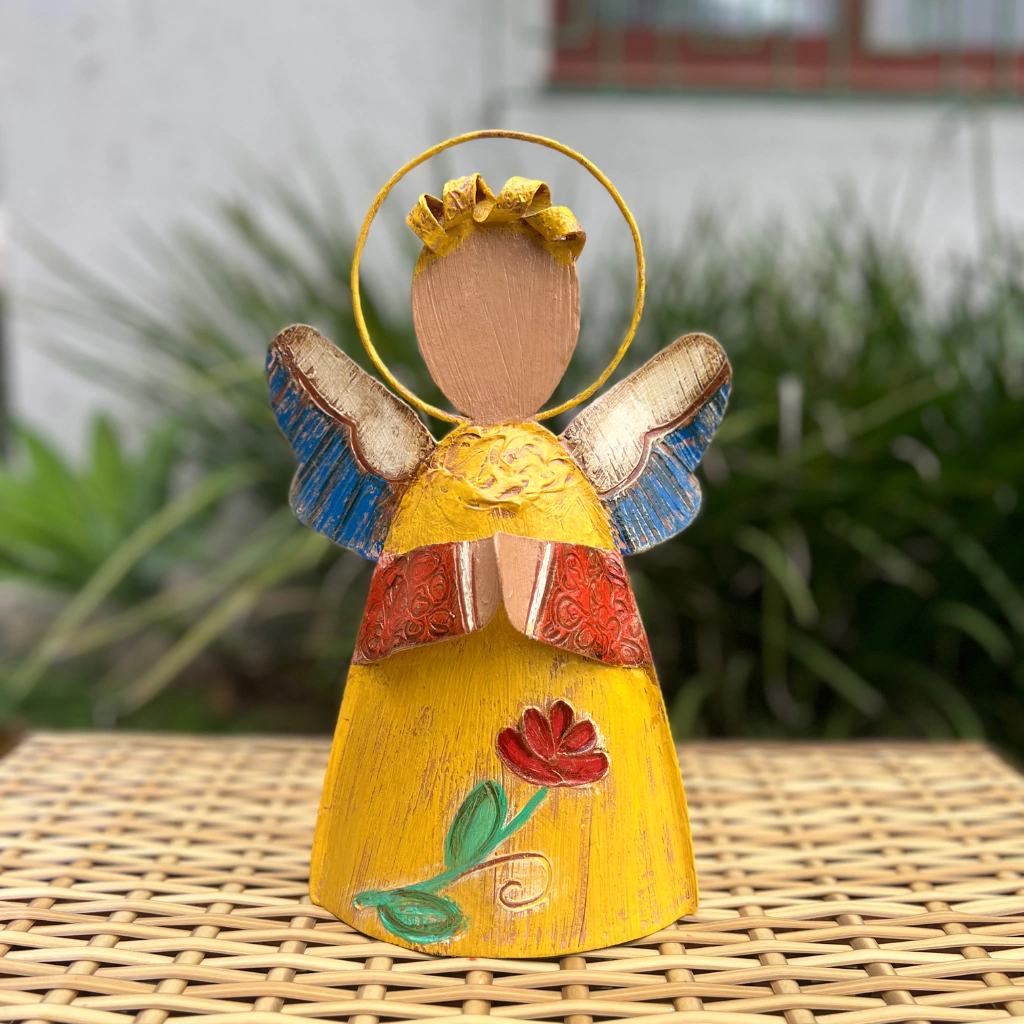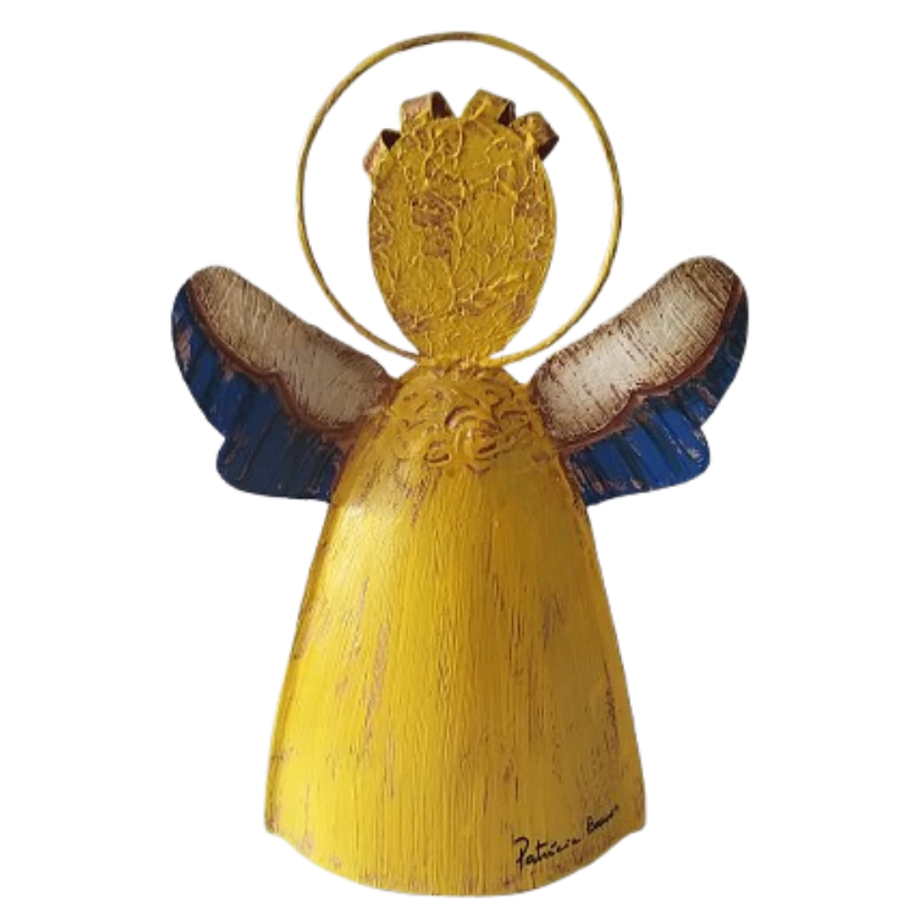 Escultura Anjo Menino Reluzente em metal é uma peça única feita de forma artesanal pela designer pernambucana Patrícia Barros. A peça esculpida em metal, transformando a matéria bruta em significado, apresenta um anjo estilizado com sua veste amarela texturizada, e uma bela flor em vermelho, e belas asinhas em branco e azuis. Depois de cortadas e moldadas manualmente com auxílio de ferramentas, as peças são soldadas e por fim finalizadas com pintura resinada, uma etapa que pode durar até 6 dias. Com a leveza das mãos, a artista, com sua criatividade, valoriza os elementos e formas da natureza para criar suas coleções. Com designer ousado, as peças rústicas enchem de estilo e sofisticação os ambientes.