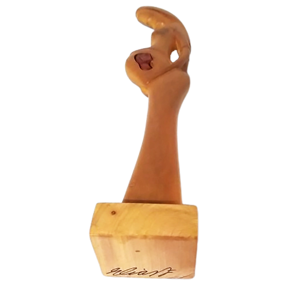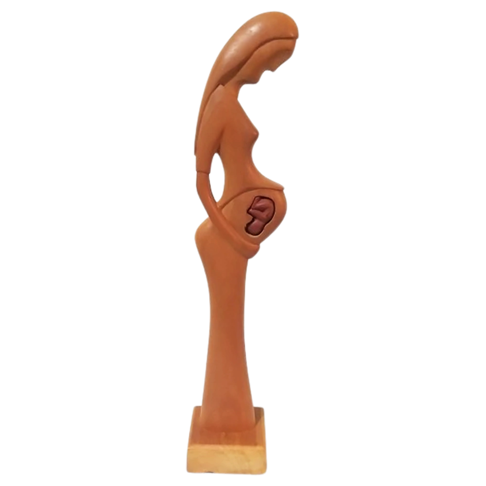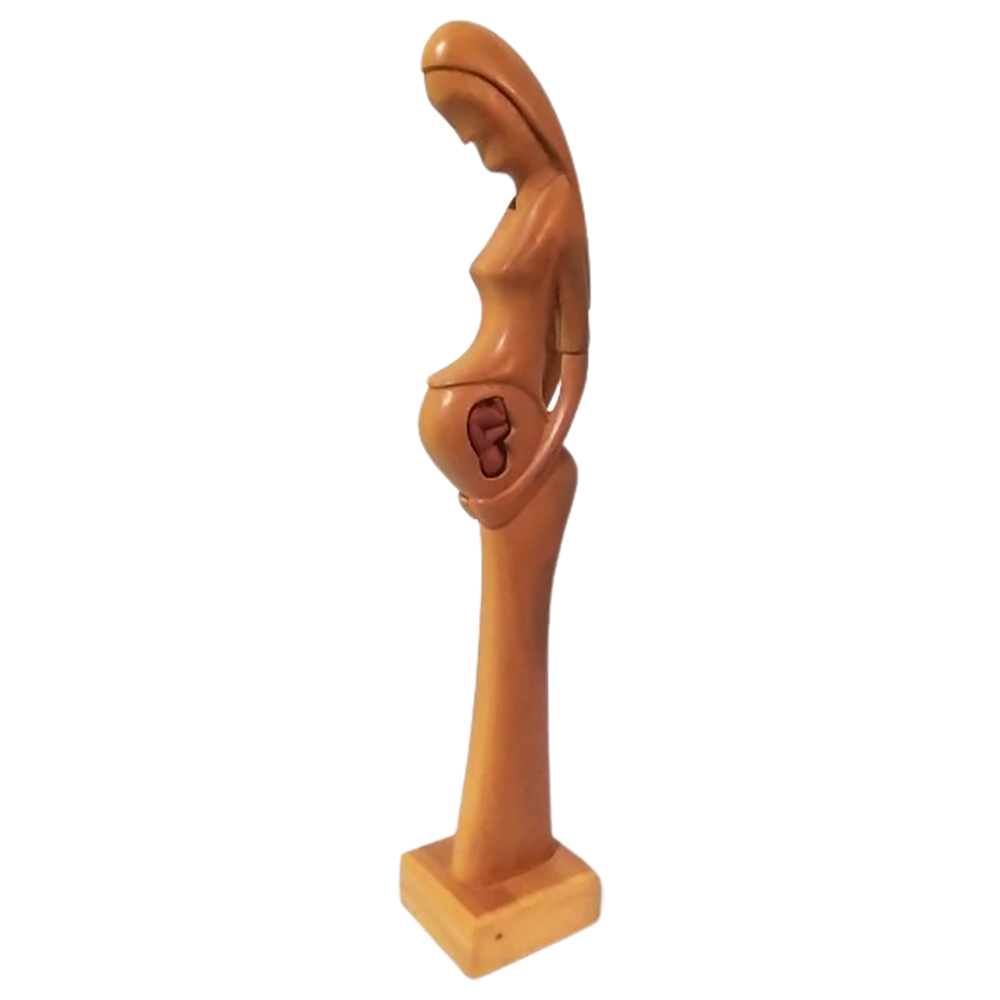 Escultura Amor de Mãe Carinhoso em madeira natural é uma peça única, feita de forma artesanal pelo Mestre Elias França, refletindo a beleza de ser mãe esculpida em madeira. A peça apresenta uma mulher grávida em pé, em madeira natural em tom mediano, com algumas marcas características da madeira em um dos lados, afagando carinhosamente a barriga com o bebê. Basta olhar o trabalho do Mestre Elias José para perceber que a sua grande inspiração é um dos momentos mais especiais da vida de uma mulher: quando ela se torna mãe. Ao ter a oportunidade de ver o carinho e cuidado que as mães demonstravam quando pegavam os seus bebês nos braços, o artesão passou a traduzir essa emoção em arte.