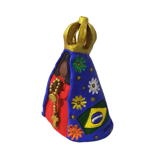 Escultura Nossa Senhora Aparecida do Brasil em cerâmica é uma peça única feita manualmente pela artesã Leila Lima da Paraíba. Moldada a partir do barro, queimada em forno e finalizada com pintura, a peça retrata Nossa Senhora da Conceição Aparecida, a padroeira do Brasil, com veste vermelha, manto azul royal com duas bandeiras do Brasil estampadas, e círculos em caracol e pontos dourados. Dourados também são a coroa e o terço que a Santa traz nas mãos. Venerada na Igreja Católica, sua pequena imagem de terracota está atualmente alojada na Catedral Basílica localizada na cidade de Aparecida, em São Paulo.