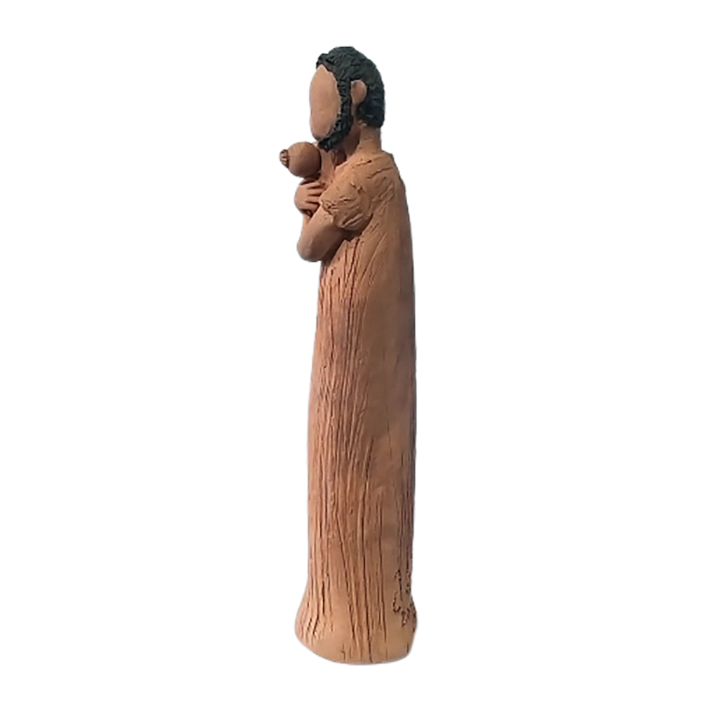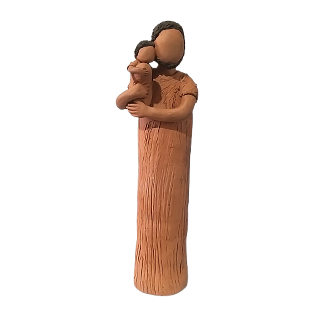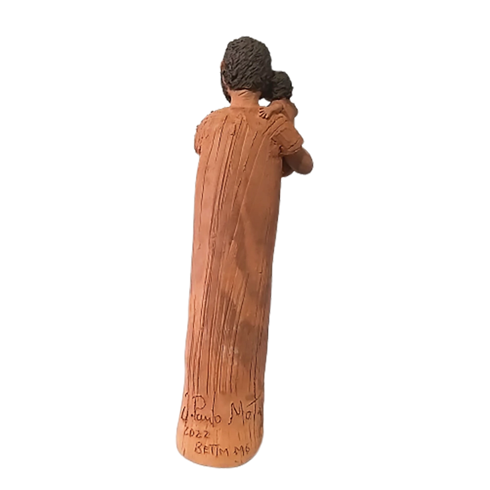 Escultura O Menino e a Bola Terral em cerâmica terracota é uma peça única, em tamanho grande, feita de forma artesanal pelo artista João Paulo de Souza, da família de Manoel Miguel de Souza, cuja arte de modelar em barro é repassada de geração em geração. Moldada a partir do barro e queimada em forno, a peça retrata um homem em pé, com um menino no colo, segurando firmemente uma bola, em um momento singular de amor e atenção maternos. Os trabalhos inspirados na vida familiar expressamo valor da família e do convívio para o brasileiro. Em Minas Gerais, o apelo é ainda maior, ancorado na cultura regional das festas e dos fazeres tradicionais.
