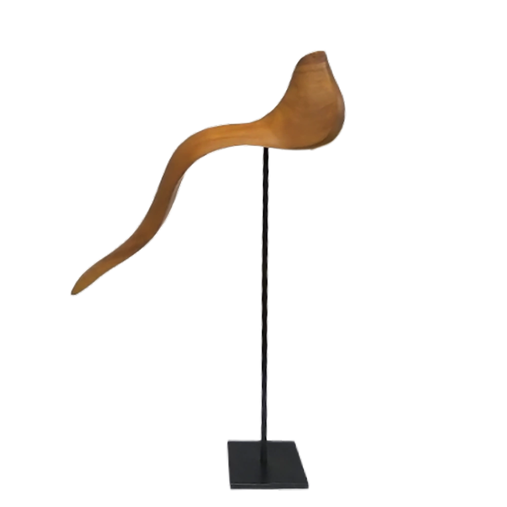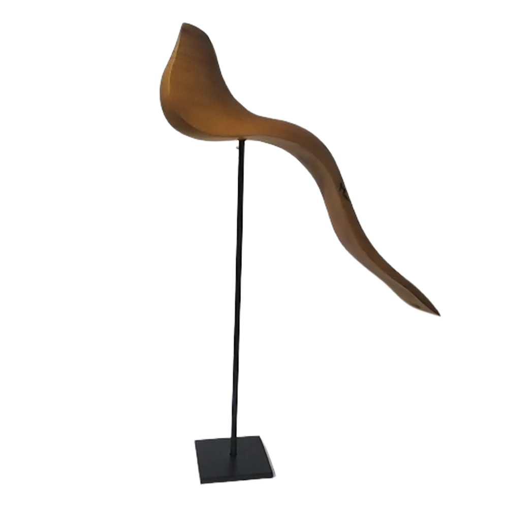 Escultura Pássaro Cauda Longa em madeira maciçacom base em ferro da Linha Pássaros é uma peça única, feita de forma artesanal, pelo artista plástico Gegê Pedrosa. A escultura tridimensional remete ao formato de um pássaro, com elementos que representam plasticamente no imaginário a elegância e a liberdade das aves, torneada a partir da madeira, o artista faz a captação da madeira, boa parte dela reciclada, a partir de demolições. A madeira, como pinho, maçaranduba e ipê, é tratada para compor um bloco, por meio de colagem e prensa, em uma técnica milenar, ainda pouco explorada na região Nordeste. Na madeira, o artista pernambucano Gegê Pedrosa encontrou uma maneira de se conectar com a natureza e objetivar conceitos. Transformando madeira em obras limpas e suaves. Gegê leva sua arte à forma mais pura. Suas esculturas são uma contemplação com momentos simples da vida e um elo com a natureza e o amor. Nas peças com base de ferro, no processo de criação das estruturas é usada laca automotiva para dar o brilho negro às artes.
