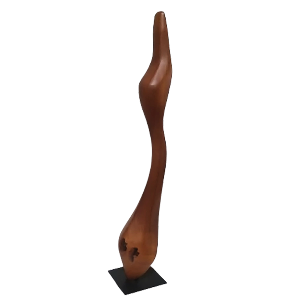 Escultura Pássaro Estilizado em madeira maciçacom base em ferro da Linha Pássaros é uma peça única, feita de forma artesanal, pelo artista plástico Gegê Pedrosa. A escultura tridimensional remete ao formato de um pássaro estilizado, com elementos que representam plasticamente no imaginário a elegância e a liberdade das aves, torneada a partir da madeira, o artista faz a captação da madeira, boa parte dela reciclada, a partir de demolições. A madeira, como pinho, maçaranduba e ipê, é tratada para compor um bloco, por meio de colagem e prensa, em uma técnica milenar, ainda pouco explorada na região Nordeste. Na madeira, o artista pernambucano Gegê Pedrosa encontrou uma maneira de se conectar com a natureza e objetivar conceitos. Transformando madeira em obras limpas e suaves. Gegê leva sua arte à forma mais pura. Suas esculturas são uma contemplação com momentos simples da vida e um elo com a natureza e o amor. Nas peças com base de ferro, no processo de criação das estruturas é usada laca automotiva para dar o brilho negro às artes.