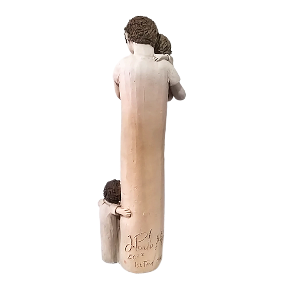 Escultura Plenitude do Amor Aconchego em cerâmicaterracota clara, em tamanho grande,é uma peça única feita de forma artesanal pelo artista João Paulo de Souza, da família de Manoel Miguel de Souza, cuja arte de modelar em barro é repassada de geração em geração. Moldada a partir do barro e queimada em forno, a peça retrata um homem em pé com um bebê no colo, este com um carrinho, e um menino ao seu lado, querendo atenção, agarrado a uma bola, em um íntimo momento de afeto materno. Os trabalhos inspirados na vida familiar expressamo valor da família e do convívio para o brasileiro. Em Minas Gerais, o apelo é ainda maior, ancorado na cultura regional das festas e dos fazeres tradicionais.