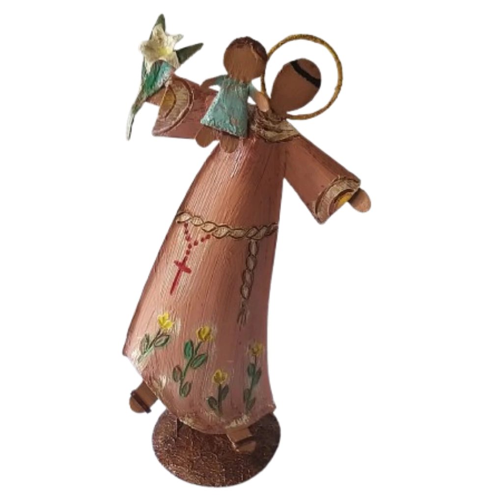 Escultura Santo Antonio em metal é uma peça única feita de forma artesanal pela designer pernambucana Patrícia Barros. A peça esculpida em metal, transformando a matéria bruta em significado, apresenta o santo em veste abege com barrado em flores, tendo no colo uma criança. Depois de cortadas e moldadas manualmente com auxílio de ferramentas, as peças são soldadas e por fim finalizadas com pintura resinada, uma etapa que pode durar até 6 dias.Com a leveza das mãos, a artista, com sua criatividade, valoriza os elementos e formas da natureza para criar suas coleções. Com designer ousado, as peças rústicas enchem de estilo e sofisticação os ambientes.