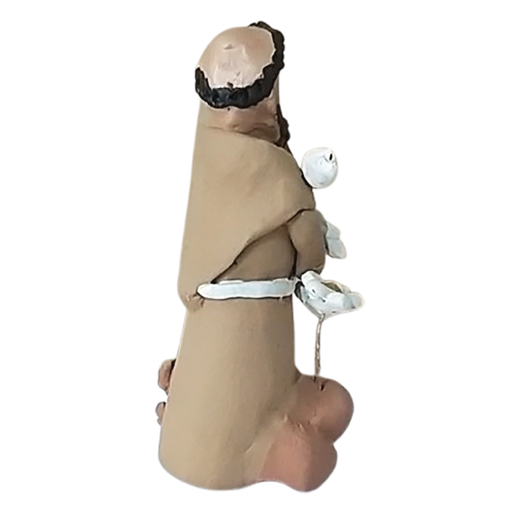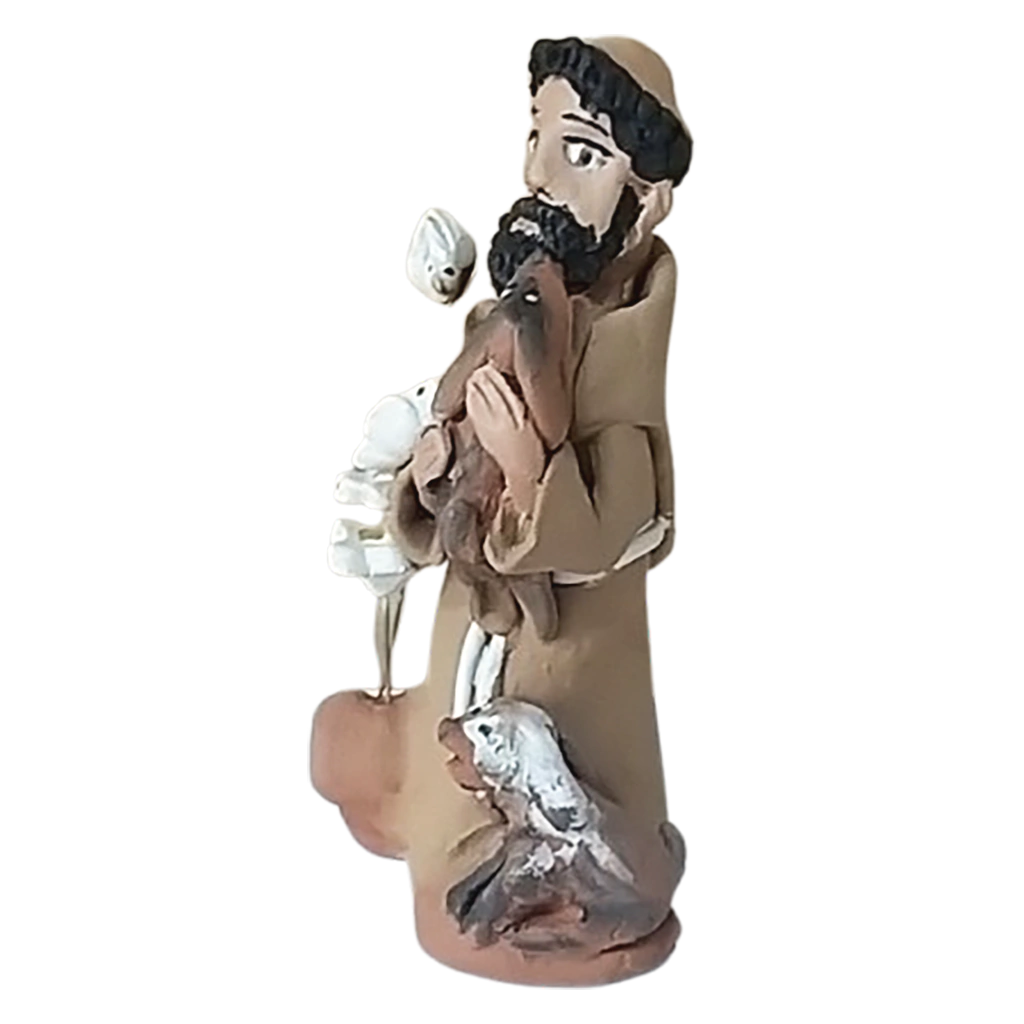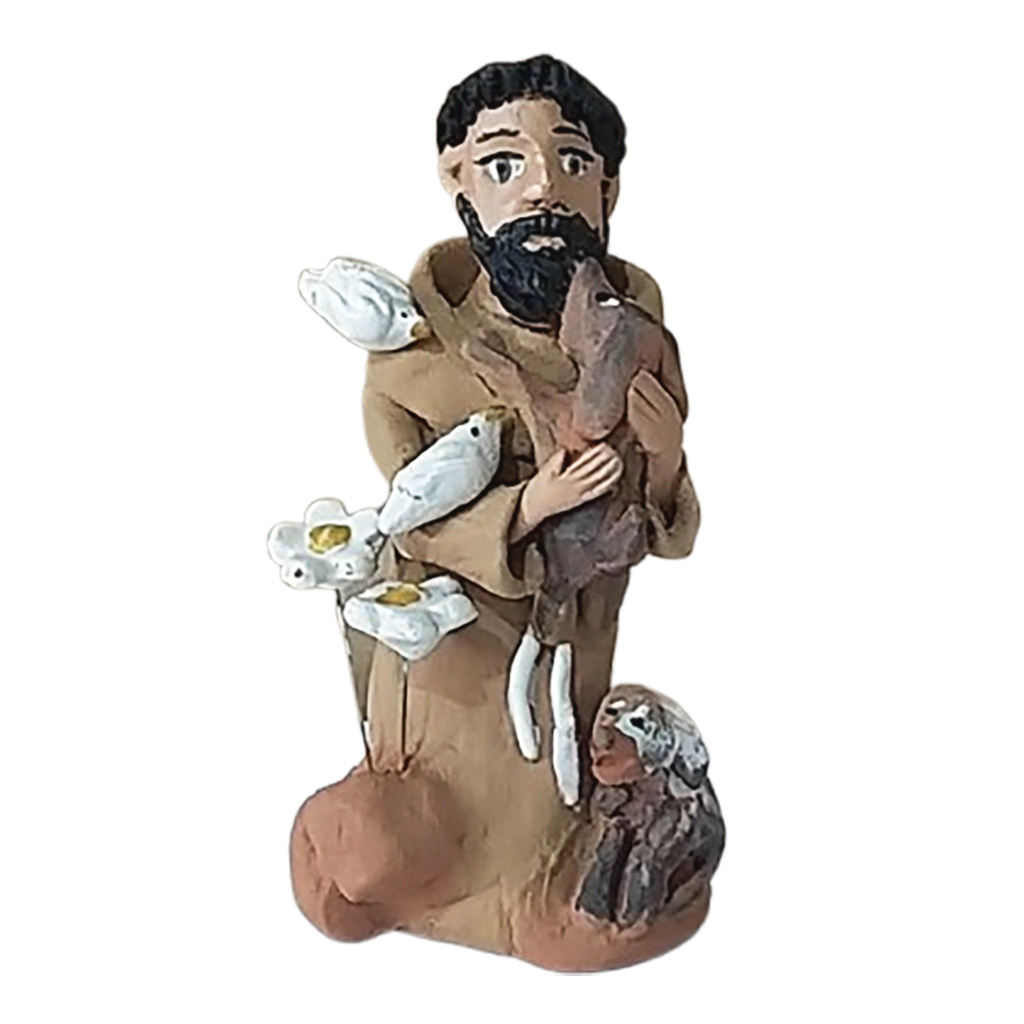 Escultura São Francisco e os Cães,em cerâmica, é uma peça única feita manualmente pela artesã Lucineia Barbosa, de Minas Gerais. A escultura de barro representa o Santo em seu longo traje franciscano marrom, rodeado por pássarose cães. Lucineia faz as peças modeladas a mão e usa a própria argila para fazer os pigmentos, que dão as cores das peças. Alguns dos pigmentos vão ao forno antes de queimar e outras cores faz com a argila depois de queimadas em forno artesanal a lenha. Para a artista, “As peças costumam falar. São caipiras como eu e muitas das vezes pego a argila para fazer o que está na mente e a argila em minhas mãos faz outras peças. Às vezes é a argila que modela em minhas mãos e não eu que modelo a argila.”