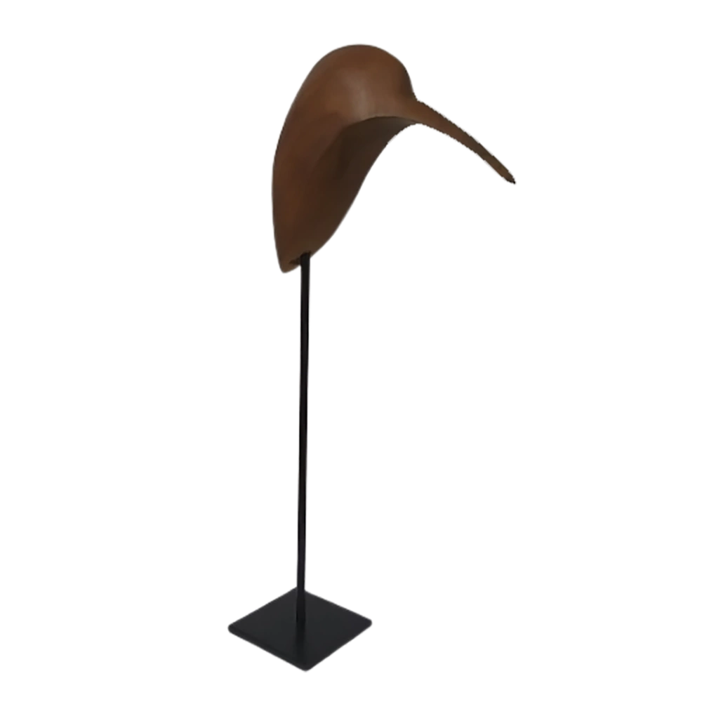 Escultura Socó em madeira maciçacom base em ferro da Linha Pássaros é uma peça única, feita de forma artesanal, pelo artista plástico Gegê Pedrosa. A escultura tridimensional remete ao formato de um pássaro socó, designação comum a várias aves pelecaniformes,de ampla distribuição, hábitos diurnos, crepusculares ou noturnos, encontradas isoladas ou aos pares,com elementos que representam plasticamente no imaginário a elegância e a liberdade das aves, torneada a partir da madeira, o artista faz a captação da madeira, boa parte dela reciclada, a partir de demolições. A madeira, como pinho, maçaranduba e ipê, é tratada para compor um bloco, por meio de colagem e prensa, em uma técnica milenar, ainda pouco explorada na região Nordeste. Na madeira, o artista pernambucano Gegê Pedrosa encontrou uma maneira de se conectar com a natureza e objetivar conceitos. Transformando madeira em obras limpas e suaves. Gegê leva sua arte à forma mais pura. Suas esculturas são uma contemplação com momentos simples da vida e um elo com a natureza e o amor. Nas peças com base de ferro, no processo de criação das estruturas é usada laca automotiva para dar o brilho negro às artes.
