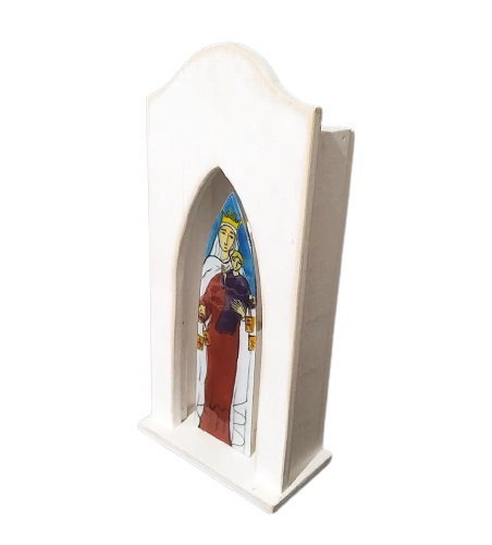 Oratório com imagem em vidro de Nossa Senhora Auxiliadora é uma peça única, feita de forma artesanal pela 2 Pontos. O oratório foi desenvolvido em madeira com pintura em pátina branca e, no seu interior, a imagem de Nossa Senhora Auxiliadora, em vidro artesanal pintado com esmalte. Nossa Senhora Auxiliadora é uma das formas de devoção da Virgem Maria, entre os católicos romanos, e sua invocação foi instituída pelo Papa Pio V, após a vitória dos cristãos sobre o exército muçulmano no estreito de Lepanto.