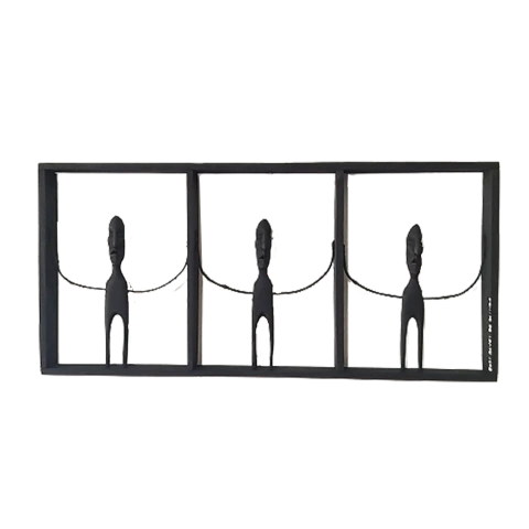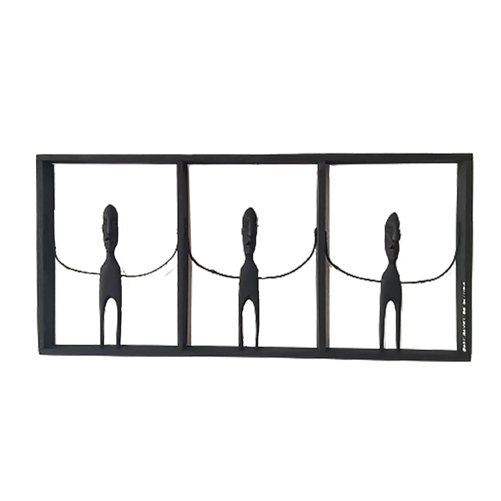 Painel Rachos 3 Figuras Horizontal é uma peça única, feita de forma artesanal pelo Mestre José Alves. A peça apresenta duas figuras de braços abertos na cor preta, cada uma delas em um espaço delimitado. As esculturas são feitas em madeira louro canela, que possui um cheiro forte, e cuja textura é de fácil manuseio e resistente a bicho. O cipó canela é colhido nas redondezas de sua casa-ateliê em Olinda, e o acabamento, com lixa e pintura, dá vida aos pedaços de madeira. Assim, navios negreiros, escravos, sacis-pererês, índios (bonecos maiores), guerreiros tribais, casas de farinha, bonecos em quadros, emergem do imaginário.