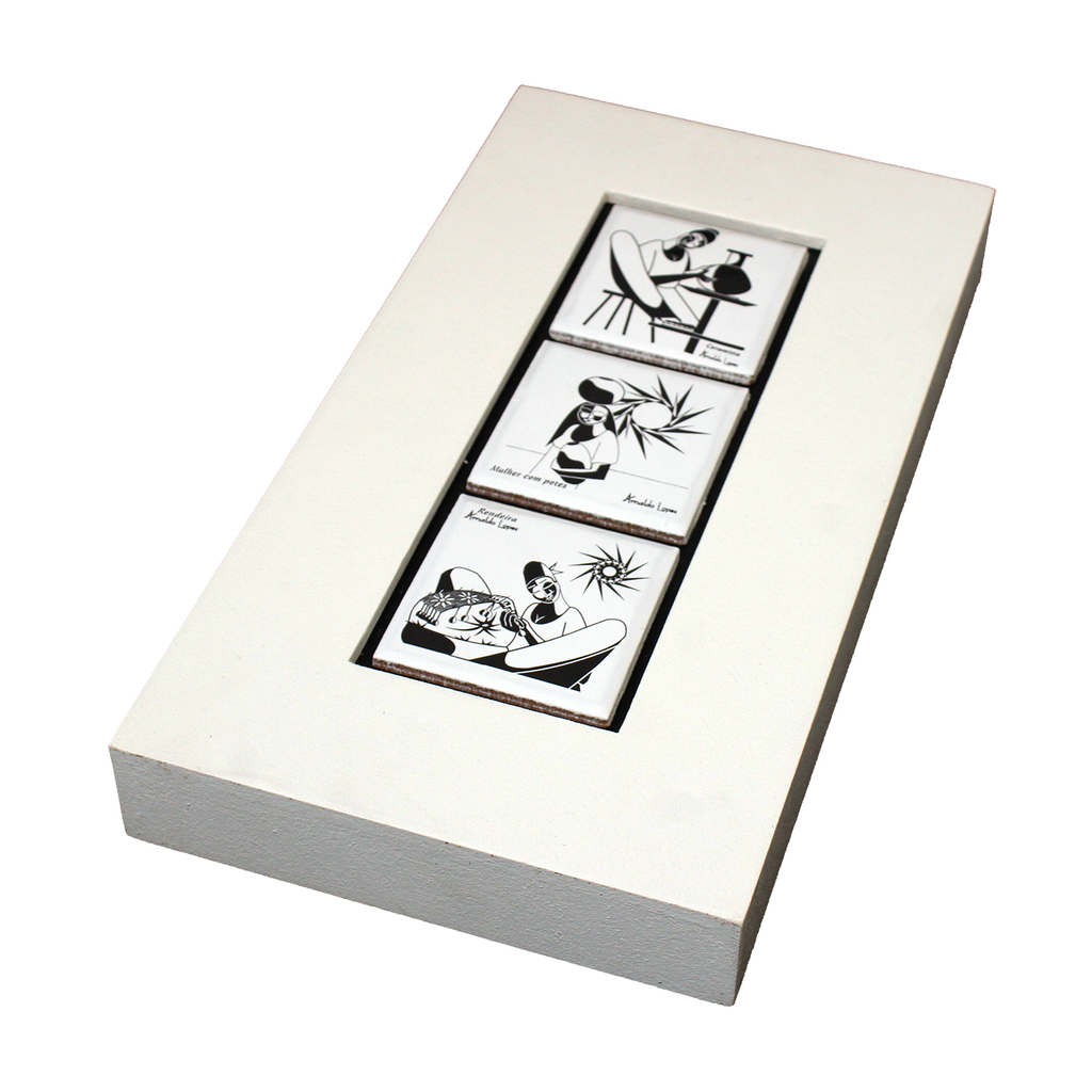 Quadro branco em madeira com aplicação de cerâmicas estampadas em serigrafia de figuras da cultura pernambucana de Arnaldo Lopes