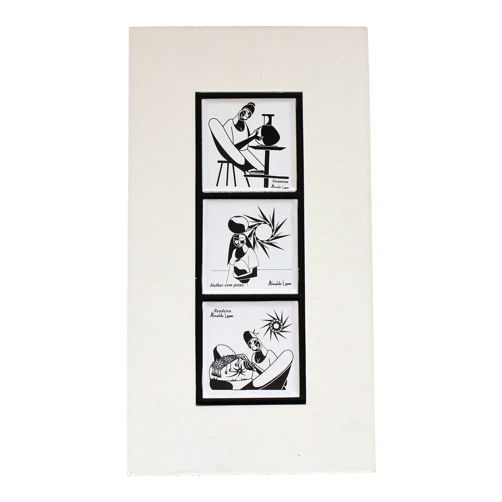 Quadro branco em madeira com aplicação de cerâmicas estampadas em serigrafia de figuras da cultura pernambucana de Arnaldo Lopes é uma peça única, feita de forma artesanal pelo artista Arnaldo Lopes. A peça é em madeira que reveste e emoldura as três cerâmicas nela aplicadas, as quais são estampadas em serigrafia de figuras representativas da cultura pernambucana: “Ceramista”, “Mulher com potes” e “Rendeira”.