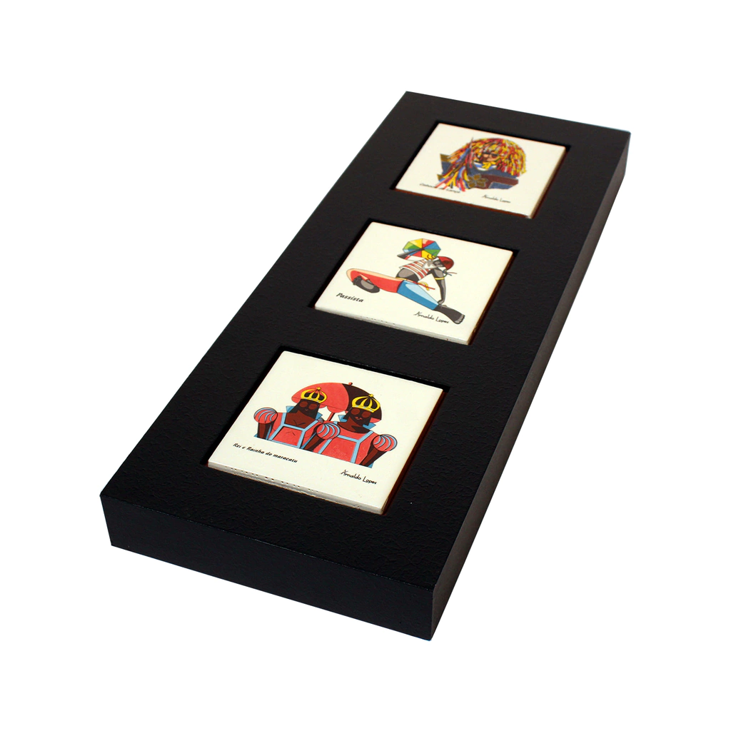 Quadro preto em madeira com aplicação de cerâmicas estampadas em serigrafia de figuras da cultura brasileira de Arnaldo Lopes é uma peça única, feita de forma artesanal pelo artista Arnaldo Lopes. A peça é em madeira que reveste e emoldura as três cerâmicas nela aplicadas, as quais são estampadas em serigrafia de figuras representativas da cultura brasileira: “Caboclo de lança”, “Passista” e “Rei e rainha do maracatu”.