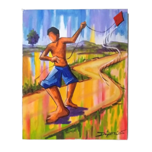 Pintura Menino com Pipa acrílica sobre tela é uma peça diferenciada e original do artista Di Farias. A tela apresenta um menino com sua bermuda azul, empinando pipa em uma via de terra, no interior. A pipa ou papagaio de papel, pandorga ou raia, é um brinquedo que voa baseado na oposição entre a força do vento e a da corda segurada pelo operador. É composta de papel que tem a função de asa, sustentando o brinquedo. Conforme o modelo pode contar com uma rabiola, que é um adereço preso na parte inferior para proporcionar estabilidade, aerodinâmica e equilíbrio. É um dos brinquedos mais utilizados por crianças, adolescentes e até adultos. Da fase Jogo de Cores, a obra de Di Farias retrata o cotidiano do povo nordestino, enfatizando os desafios e as características da vida no sertão, a infância e as manifestações culturais, em cores fortes e impactantes.