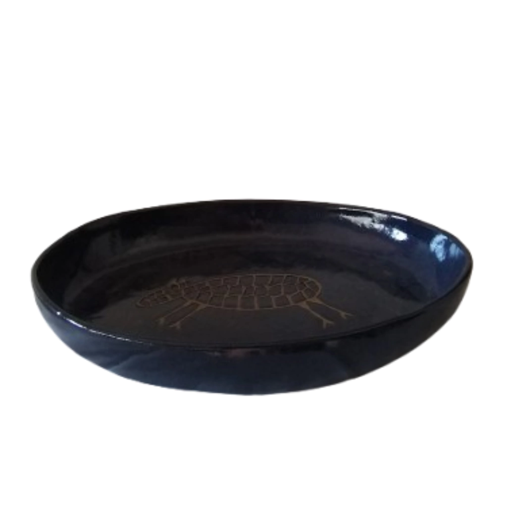 Travessa Oval Rasa, em cerâmica é uma peça única feita de forma artesanal por ceramista do Grupo Cerâmica Artesanal Serra da Capivara, no Piauí. A travessa, rasa em formato retangular ovalado, é uma peça utilitária e decorativa, confeccionada artesanalmente em barro com acabamento em pintura à mão na cor azul, e desenho rupestre de animal. Nas figuras rupestres, os registros do homem primitivo mostram o cotidiano, os animais, um universo milenar diante dos olhos de quem passa. O barro é a matéria prima do trabalho e é com ele que os artesãos plasmam nas peças os desenhos conservados nos sítios arqueológicos. No processo de produção, as impurezas são separadas da argila para, depois, ser manipulada manualmente pelos artistas. Em seguida, as gravuras são pintadas à mão, reproduzindo os traços dos homens primitivos. Já trabalhadas, as peças são colocadas para secar e algumas são tingidas na própria argila, para então serem pintadas e vitrificadas, o que traz um toque de sofisticação especial.