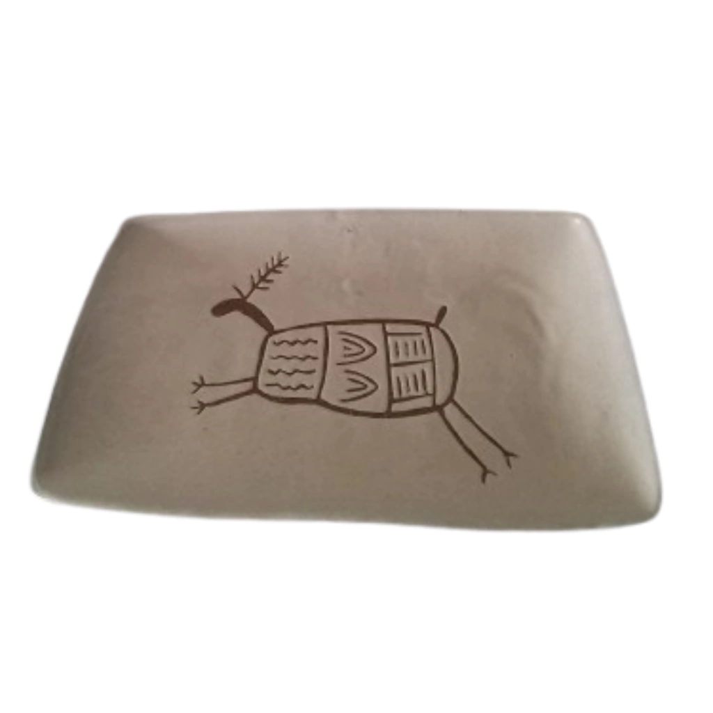 Travessa Petisco Animal em cerâmica é uma peça única feita de forma artesanal por ceramista do Grupo Cerâmica Artesanal Serra da Capivara, no Piauí. A travessa, é confeccionada artesanalmente em barro, com acabamento em pintura à mão na cor bege , e desenho rupestre de figura animal. Nas figuras rupestres, os registros do homem primitivo mostram o cotidiano, os animais, um universo milenar diante dos olhos de quem passa. O barro é a matéria prima do trabalho e é com ele que os artesãos plasmam nas peças os desenhos conservados nos sítios arqueológicos. No processo de produção, as impurezas são separadas da argila para, depois, ser manipulada manualmente pelos artistas. Em seguida, as gravuras são pintadas à mão, reproduzindo os traços dos homens primitivos. Já trabalhadas, as peças são colocadas para secar e algumas são tingidas na própria argila, para então serem pintadas e vitrificadas, o que traz um toque de sofisticação especial.