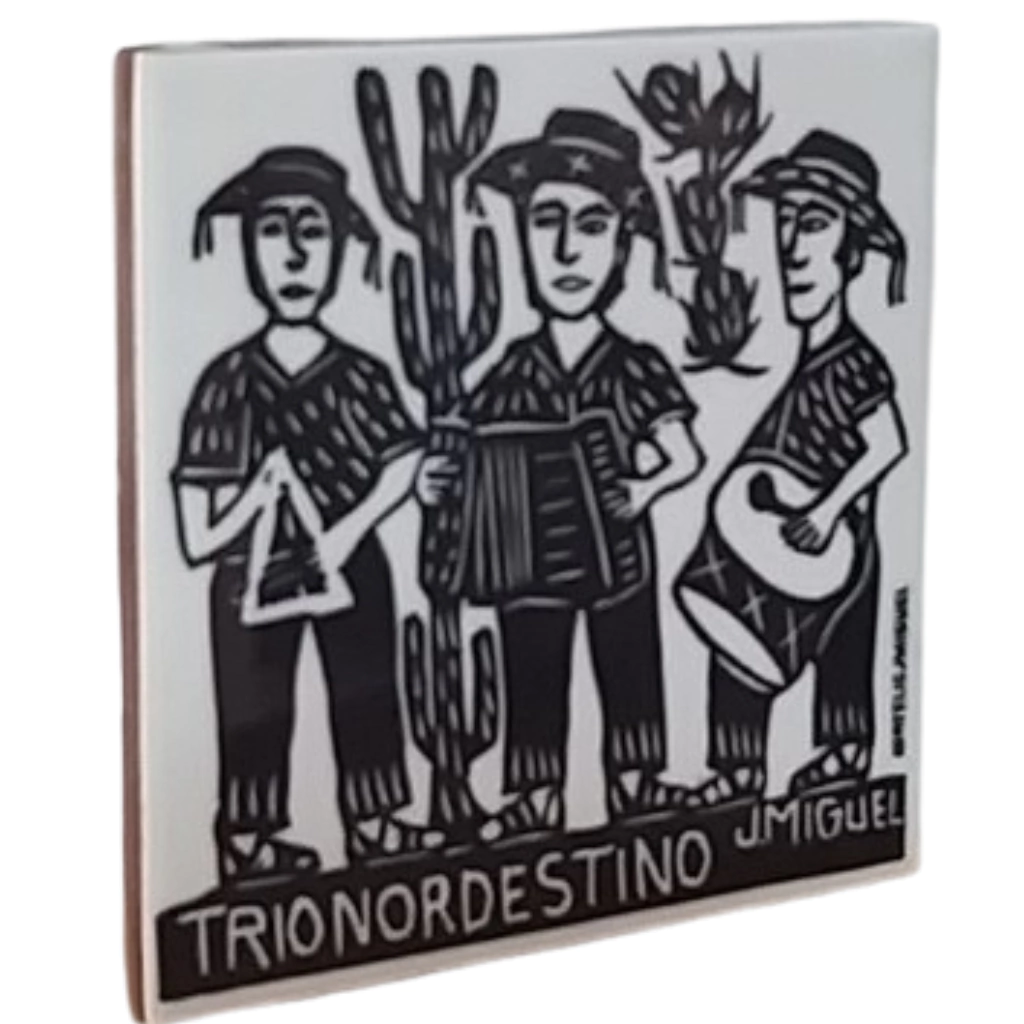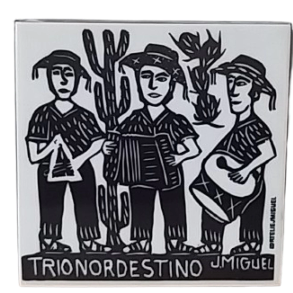 Xilogravura em azulejo Trio Nordestino é uma peça feita artesanalmente pelo artista J. Miguel. A xilogravura apresenta um trio de musicos, sobre um fundo branco e a característica assinatura de J. Miguel. Em geral ao entardecer, os pássaros alçam voo e, em revoada, como se fossem um organismo único e maleável, executam malabarismos nos ares. Em manobras rápidas, os integrantes do bando mudam frequentemente de direção e velocidade, criando formas gigantescas no céu. A xilogravura é uma técnica de gravura que se utiliza de uma madeira entalhada com algum desenho como matriz e possibilita a reprodução da imagem gravada sobre o papel ou outro suporte. As xilogravuras da família Borges são impressas em diversos tamanhos e vendidas a intelectuais, artistas e colecionadores de arte, pela sua técnica própria de colorir as imagens, representando o cotidiano do pobre, o cangaço, o amor, os castigos do céu, os mistérios, os milagres, crimes e corrupção, os folguedos populares, a religiosidade, a picardia, sempre ligados ao povo nordestino.