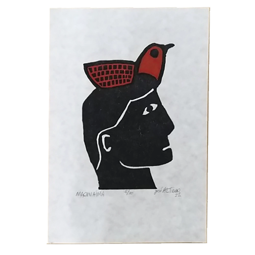 Xilogravura Macunaíma e Corrupião é uma peça única feita artesanalmente pelo artista José Altino. A bela xilogravura, em branco e preto, retrata o lendário personagem Macunaíma com um corrupião em vermelho. Macunaíma, o herói índio sem nenhum caráter é um livro publicado em 1928 pelo polímata brasileiro Mário de Andrade, considerado a sua obra-prima, uma trajetória movimentada e aventuresca em busca de uma pedra mágica, o muiraquitã, que havia recebido de seu grande amor, a Mãe do Mato, mas que fora perdida. A xilogravura é uma técnica de gravura que se utiliza de uma madeira entalhada com algum desenho como matriz e possibilita a reprodução da imagem gravada sobre o papel ou outro suporte. As gravuras de José Altino são ambientadas na cultura popular, com grande inspiração da literatura de cordel e do rico imaginário da cultura nordestina. Além dos trabalhos impressos a partir das chapas de madeira, suas gravuras também são impressas a laser, numerados e assinados. Bichos, rostos humanos, figuras do imaginário são temas frequentes nas obras do artista.